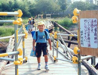 7月10日(水)から11日(木)朝にかけての大雨による高麗川の激流で多和目天神橋は湾曲し、通行不能となりました。8月12日(月)、多和目1区から4区までの区長がそろって、「多和目天神橋の1日も早い復旧を」と、市役所を訪れ、市長に申し入れを行ないました。 2学期をむかえて元気に天神橋を渡る小学生 その際、当面、城山小中生の安全な通学のために歩行者のみ通行できる方法を求めました。このほど、橋脚部を強化し、上部には柵を設け、2学期開始に間に合わせ、城山小中生の安全な通学ができることになりました。 多和目天神橋の全景 なお、橋全体の復旧については、9月議会に補正予算として復旧工事費が提案されています。 |