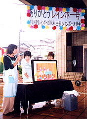 移動図書館レインボー号は、1982年(昭和52年)9月より運用が開始され、22年間で約53万冊が貸し出され約19万人に利用されました。自動車排気ガス規制などの事情により、9月末をもって役割を終えることになり、レインボー号を支えてきた連絡会により、「お別れ会」が行なわれました。あいにくの雨模様でしたが、図書館前広場に会場が設営されました。 その後、ボランティアの手によって「レインボー号のあゆみ」が紙芝居で上演されました。「お別れ会」のフィナーレは、花で飾られたレインボー号の最後の出発の見送りでした。参加者一同、手をふったり拍手をして「別れ」を惜しみました。 廃止は残念、学校図書の充実をお別れ会にも参加した、レインボー号のボランティアの役割を果たしてきた方が次のように感想を寄せてきました。