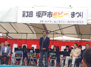 4月29日〜5月29日まで開催されているポピーまつりの「イベント開会式」が5月14日(土)、開催されました(主催=坂戸市ポピー栽培実行委員会・坂戸市)。 10時から始まった開会式では、栗原一雄坂戸市ポピー栽培実行委員会会長より、今期は雨が多かったので種を3回も蒔いたが一部生育不良のところもありますが、みんなの協力で一生懸命育ててきました。今日・明日のイベントも、模擬店も、たくさんあり、ポピーの花と一緒に大いに楽しんでください…と苦労話を交えた挨拶があり、その後、市長をはじめ来賓の挨拶、紹介などが行なわれました。 ステージのイベントは2日間行なわれ、初日は地元の 坂戸市のポピー栽培は、今年で3年目を迎えますが、100人を超えるボランティアの方々が協力してすすめています。昨年の10月に種を蒔き、その後、寒い時期からの草取りや雨で生えない部分の植え付け、まつり期間中の駐車場の整備・イベントのテントや会場設営等々、1年がかりで準備し、ポピーの花を咲かせました。 今年のポピーは天候不順により開会式の時点では三分咲き程度でしたが、まだこれからが見ごろです。ぜひ、お出かけください。 ポピー栽培ボランティア あらい文雄 |