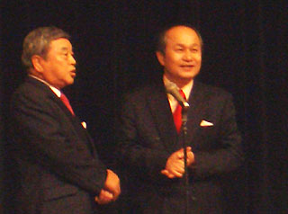 第一部の式典のあと、第二部の演芸アトラクションでは、浪曲漫才コンビの「大空なんだ・かんだ」、歌謡曲の三船和子さんが出演しました。三船和子さんは歌いながら客席の間に入り、握手をしていき、参加しているお年よりの方々は大喜びでした。
