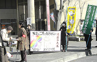 1月9日(月)、成人式の日、式場になった坂戸市文化施設オルモの前で、坂戸原水協、新婦人坂戸支部、坂戸鶴ヶ島年金組合や共産党支部の人たち、20数名で、「核兵器廃絶を訴える」新しい署名、「憲法九条を守る」署名を新成人たちによびかけ、核兵器廃絶署名は33筆、九条を守る署名も33筆集まりました。 成人式だからにぎやかにやろうと、「憲法のぼり」や新婦人めんどり班がつくった「九条タペストリー」をもって、核戦争を絶対させてはならない、そのために戦争放棄を誓った九条を守ろうと訴えると、晴れ着姿の新成人が次々と署名に応じてくれました。 |