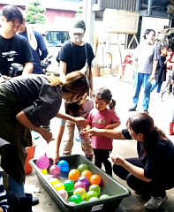食後は、地区体育祭の準備で遅れて参加したあらい文雄議員が、子供たちのために用意してくれた輪投げゲームやヨーヨー風船、鈴のくじ引きなど、お祭りの縁日のように親子共々に楽しみながら交流しました。